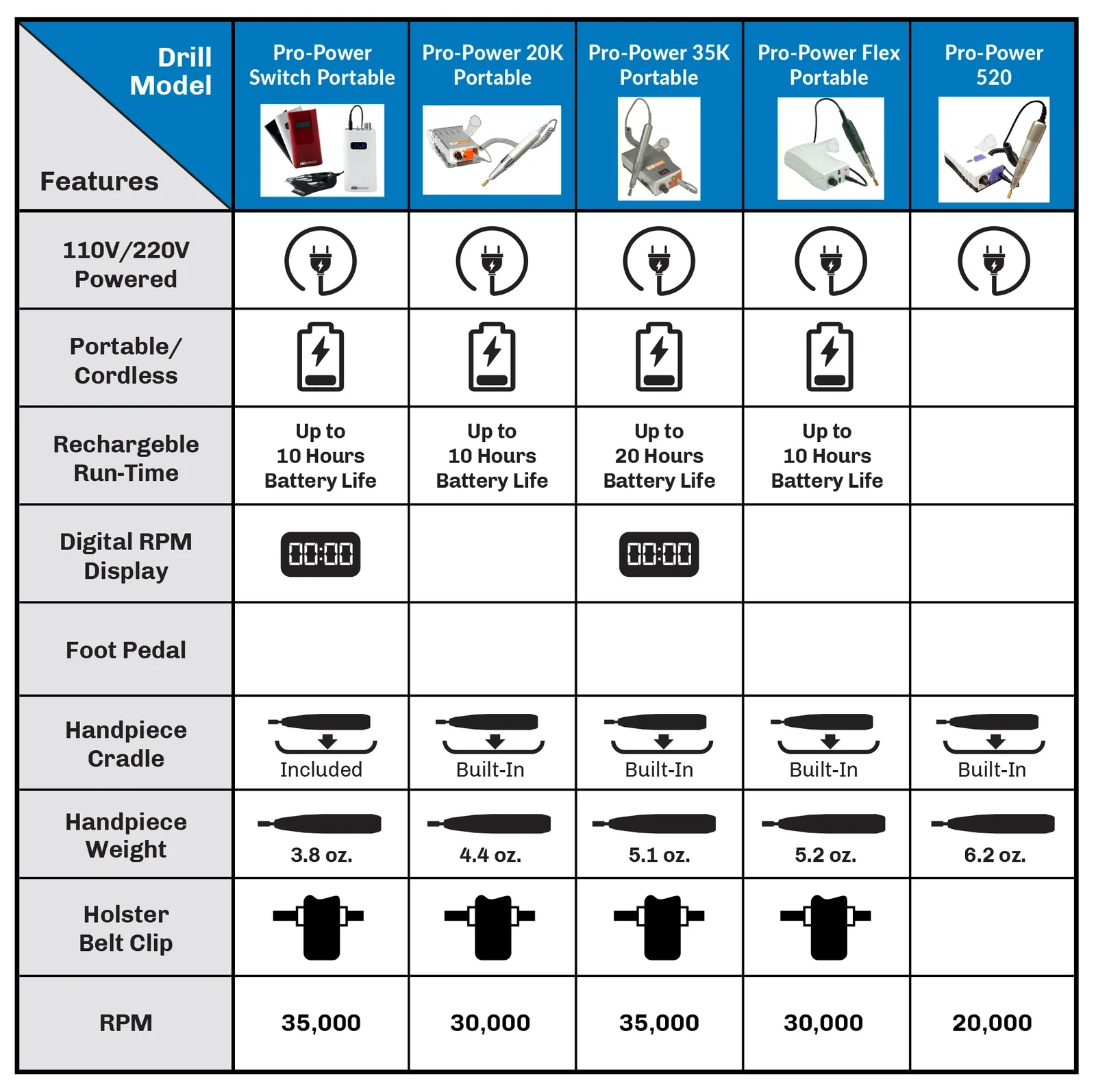 The Pro Power 35K PORTABLE is a professional and rechargeable manicure-pedicure System. Its cordless, rechargeable design allows for convenient portability making it a versatile filing system for any workstation orĀ it clips conveniently to your belt allowing freedom of movement.